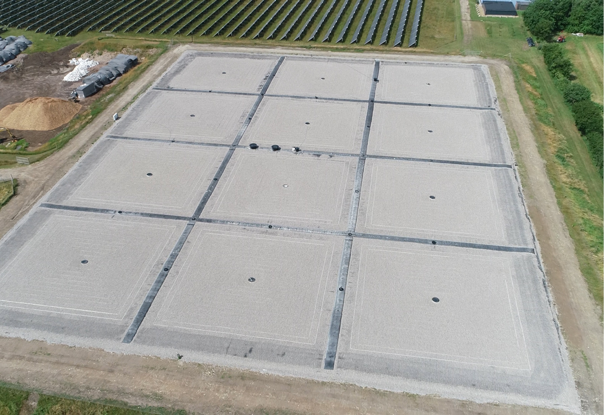 Im April 2020 wurde eine neue Abdeckungslösung auf den 70.000 m³ großen Erdbecken-Speicher für Marstal’s Fernwärmenetz installiert. Die Abdeckung hat ein neues Design, welches eine Feuchtigkeitsansammlung verhindert und die Trockenhaltung der Oberfläche erleichtert. Dadurch sind die Wärmeverluste geringer und der Wirkungsgrad und Zuverlässigkeit des Energiesystems höher.